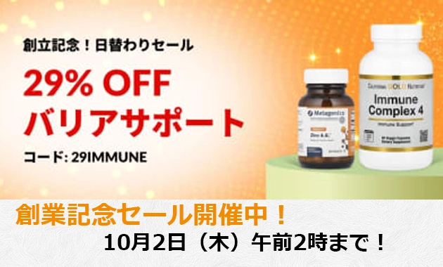 iHerbは9月で創業29周年を迎えました!創業記念セールは水曜日から金曜日までは「日替わり」で合計12回、土曜日から翌週の水曜日2時までは「週末セール」が合計4回開催されます。割引率は周年数にあわせて29%割引です!今回は第21弾となりますが、今年のアニバーサリーセールは、第21弾をもってフィナーレ。来年の開催もどうぞお楽しみに!さて、セール内容は「免疫強化サプリメント全商品の29%割引セール」です。割引に利用できるクーポンコードは「29IMMUNE」です。セール期間は10月2日(木)午前2時までの期間限定となりますので、ぜひお見逃しなく。