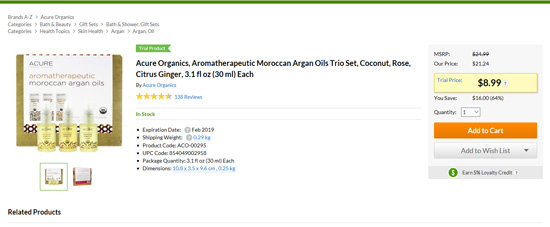 ・ Acure Organics, Aromatherapeutic Moroccan Argan Oils Trio Set, Coconut, Rose, Citrus Ginger, 3.1 fl oz (30 ml) Each 21.24ドル → 8.99ドル