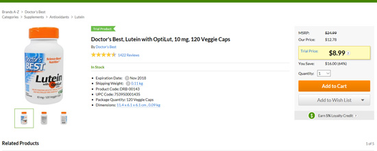 ・ Doctor’s Best, Lutein with OptiLut, 10 mg, 120 Veggie Caps 12.78ドル → 8.99ドル