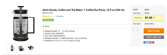 おためしセール!iHerbオリジナルのコーヒー&ティープレスメーカーをわずか1ドルでセール販売中です!