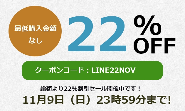 2025年11月第3弾のスペシャルセールが始まりました!割引内容はお買い上げ総額より22%割引セール」となります。今回のセールには金額条件はありません。割引に必要な今回のクーポンコードはLINE22NOVです。セール期間は11月9日(日)23時59分までの期間限定となりますので、ぜひお見逃しなく!