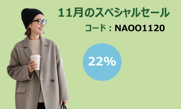 2025年11月第5弾のスペシャルセールが始まりました!割引内容はお買い上げ総額より22%割引セール」となります。今回のセールには金額条件はありません。割引に必要な今回のクーポンコードはNAOO1120です。セール期間は11月16日(日)23時59分までの期間限定となりますので、ぜひお見逃しなく!