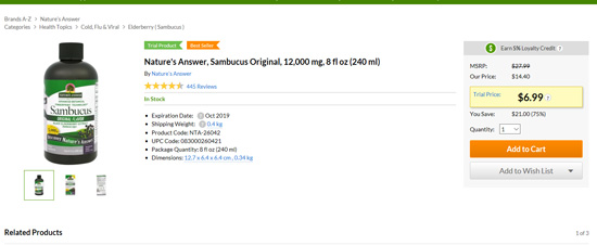 ・ Nature’s Answer, Sambucus Original, 12,000 mg, 8 fl oz (240 ml) 14.40ドル → 6.99ドル