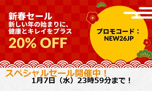 2026年最初の新春セールが始まりました!割引内容はお買い上げ総額より20%割引セール」となります。今回のセールは金額条件はありません!割引に必要な今回のクーポンコードはNEW26JPです。セール期間は1月7日(水)23時59分までの期間限定となりますので、ぜひお見逃しなく!