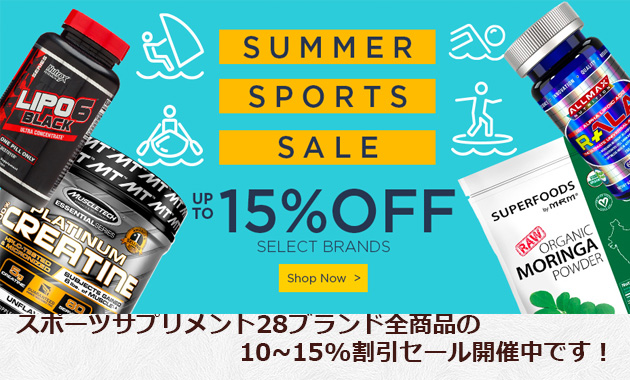 スペシャルセール!スポーツサプリメント28ブランド全商品の10~15%割引セール開催中です!
